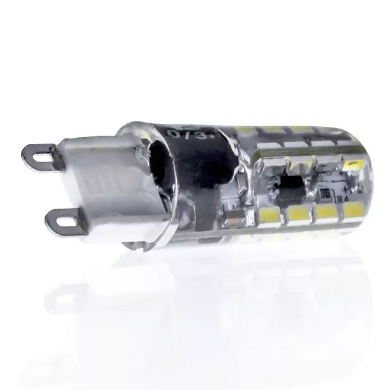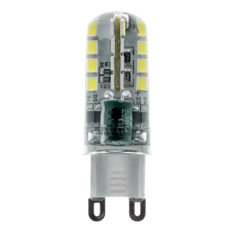 Lámpara Base Led G9, Blanco Calido 5w óptica 360° aluminio cubierta acrílica transparente, 110-127V ca, protección IP20.
