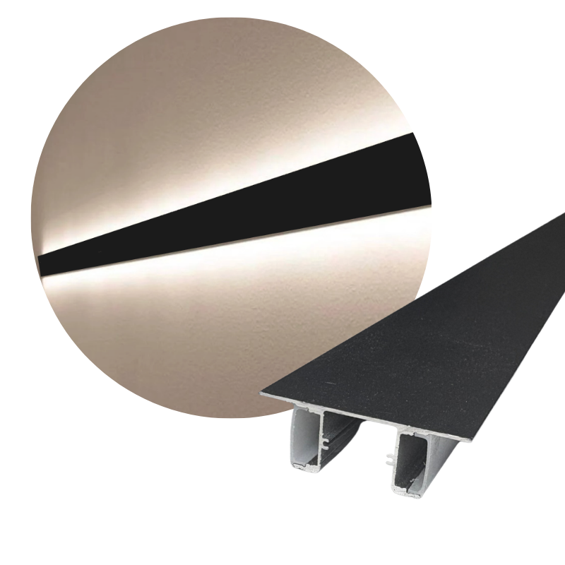 Este perfil de aluminio negro en T, ideal para iluminar paredes con luz indirecta en interiores o exteriores, está diseñado para ser sobrepuesto. Cuenta con un difusor de acrílico con protección UV para una luz suave y uniforme.