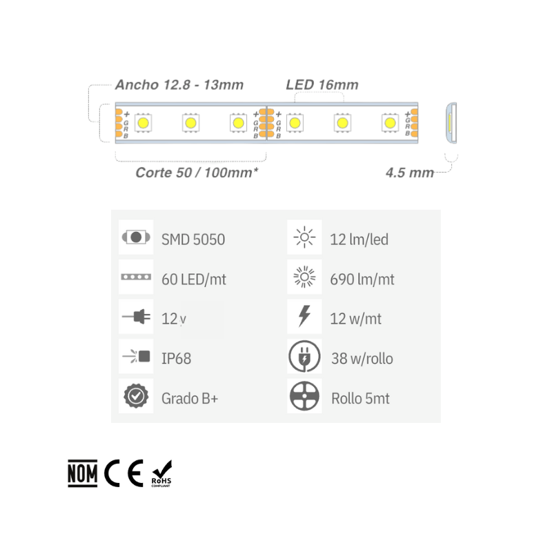 La protección IP68 consta de una capa gruesa de silicón impermeable, que cubre por completo la totalidad de la tira, además de un relleno de gel especial que mejora el aislamiento. No se recomienda sumergir. Se recorta cada 5 cm.