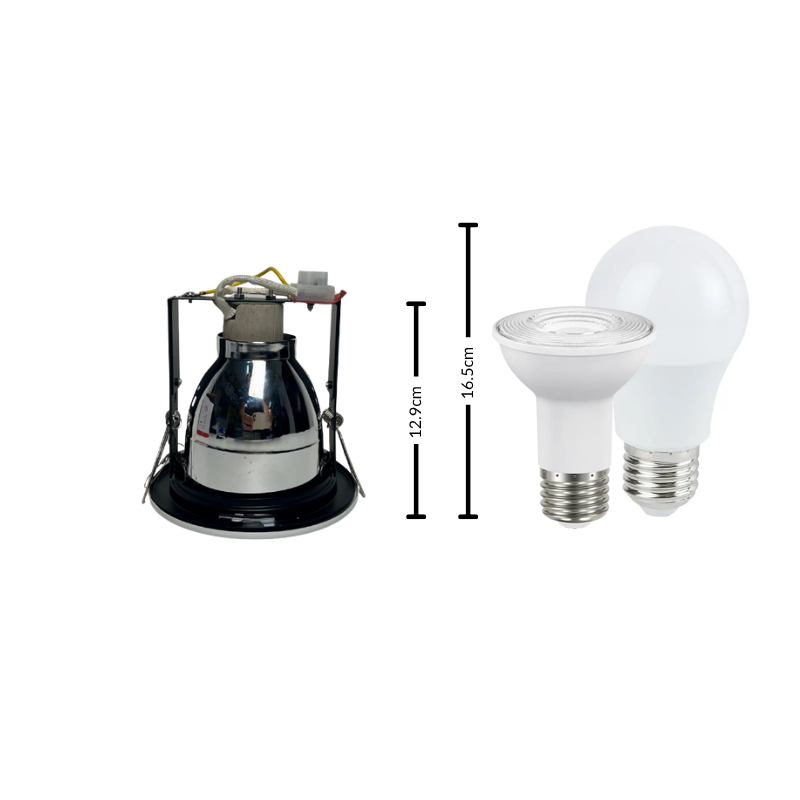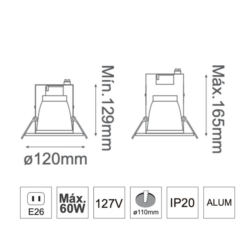 Altura ajustable: de 12.9 cm (mínima) a 16.5 cm (máxima), ideal para colocar focos compatibles según el tamaño requerido. Diseñado para empotrar en huecos de 11 cm de diámetro.